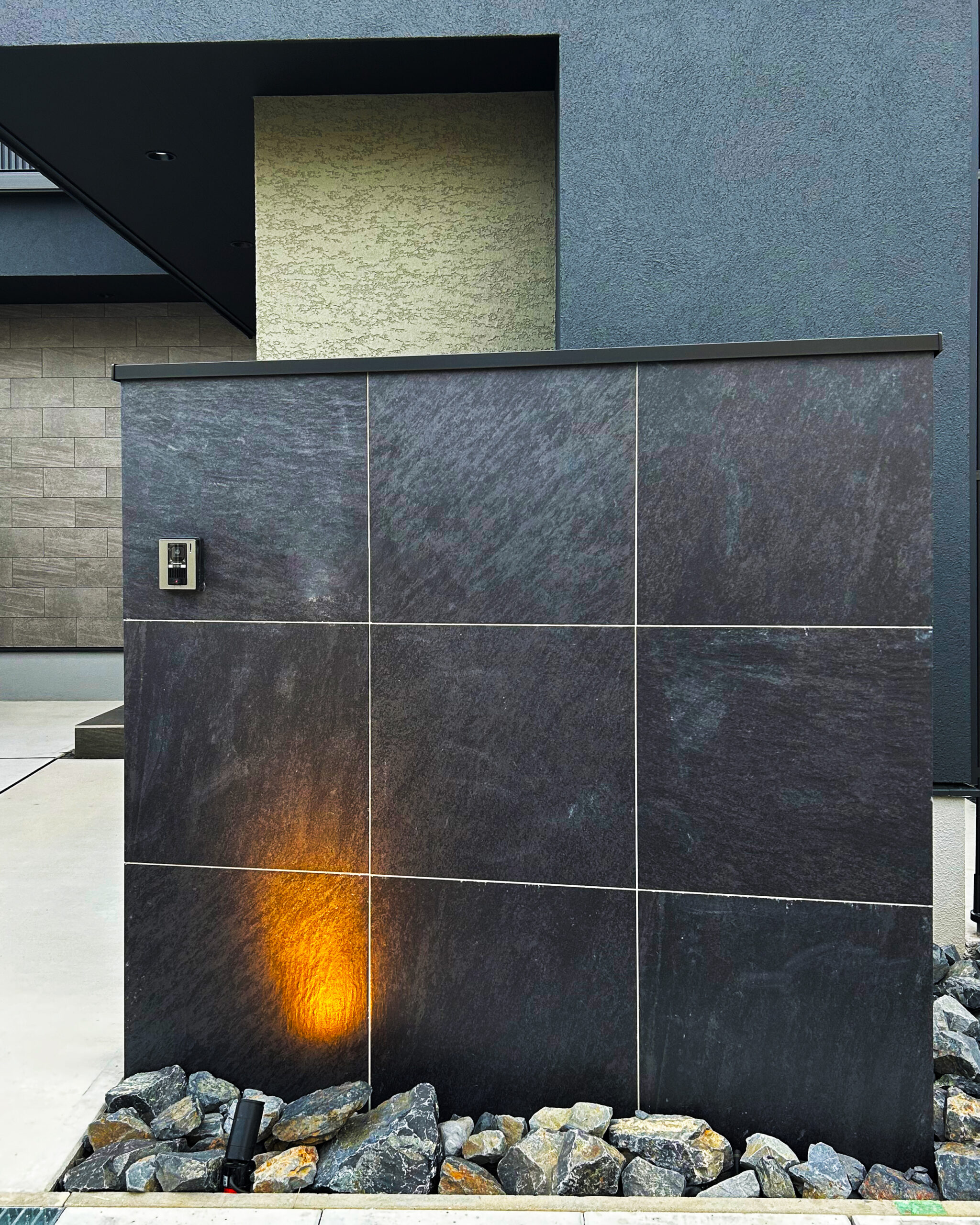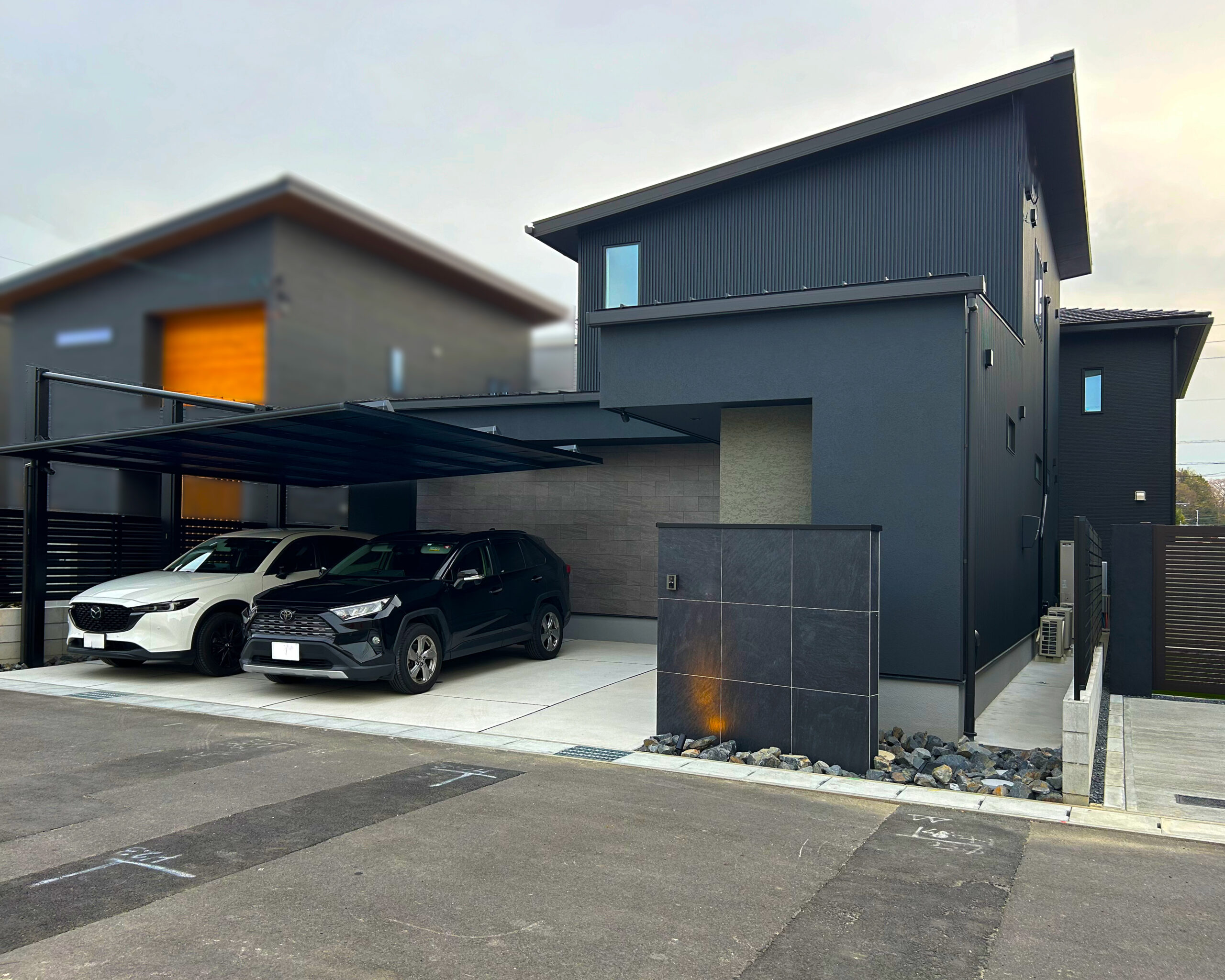 モダンですっきりとしたファサード。門柱は建物外壁に合わせたアースカラーのストーンタイル。ダブルフェースのカーポートは建物の外観デザインを邪魔することなく、屋根材がすべてブラックポリカのため、直射日光をさえぎることで夏場に車内が高温になるのを防ぎ、愛車の色褪せや日焼けから守ります。