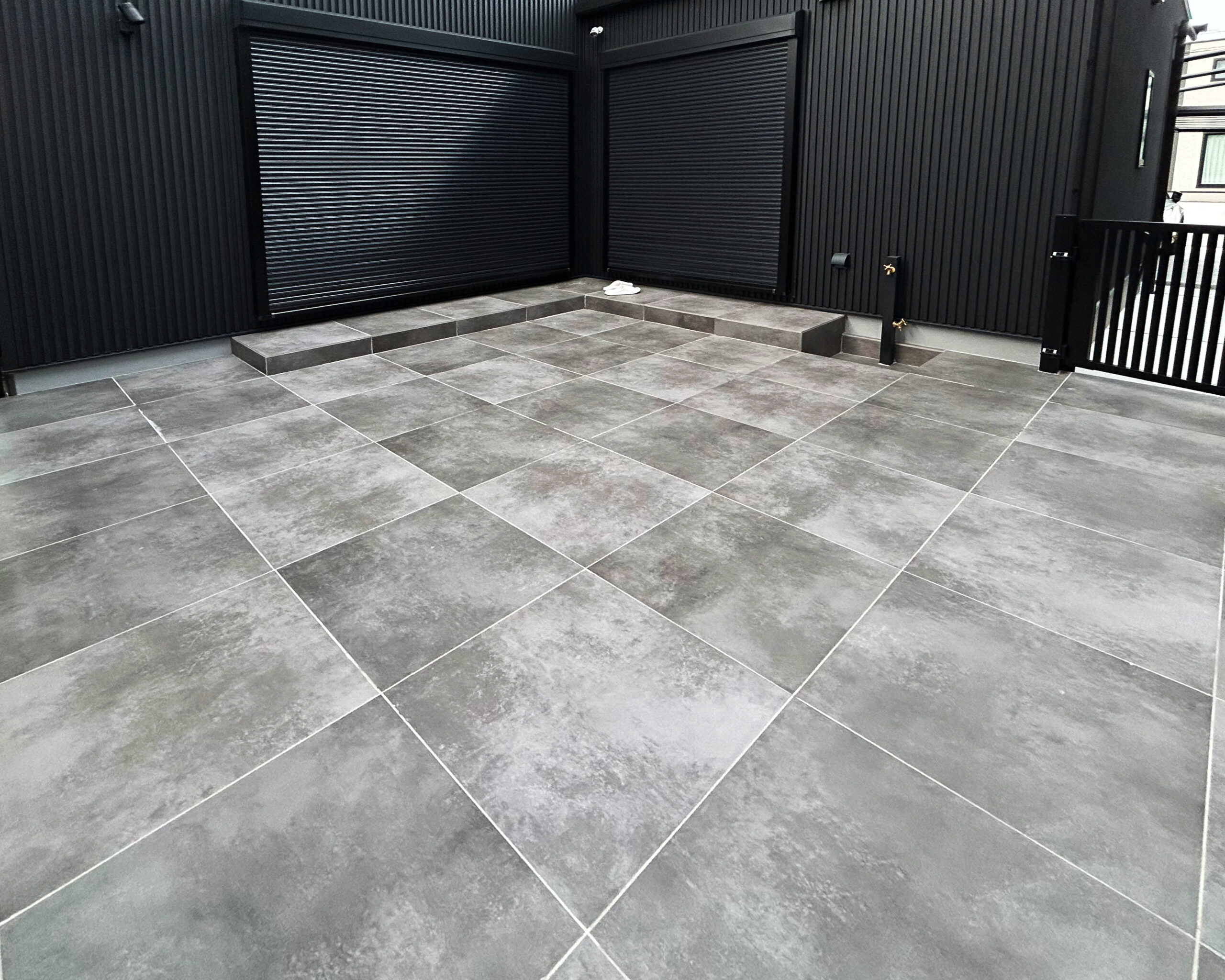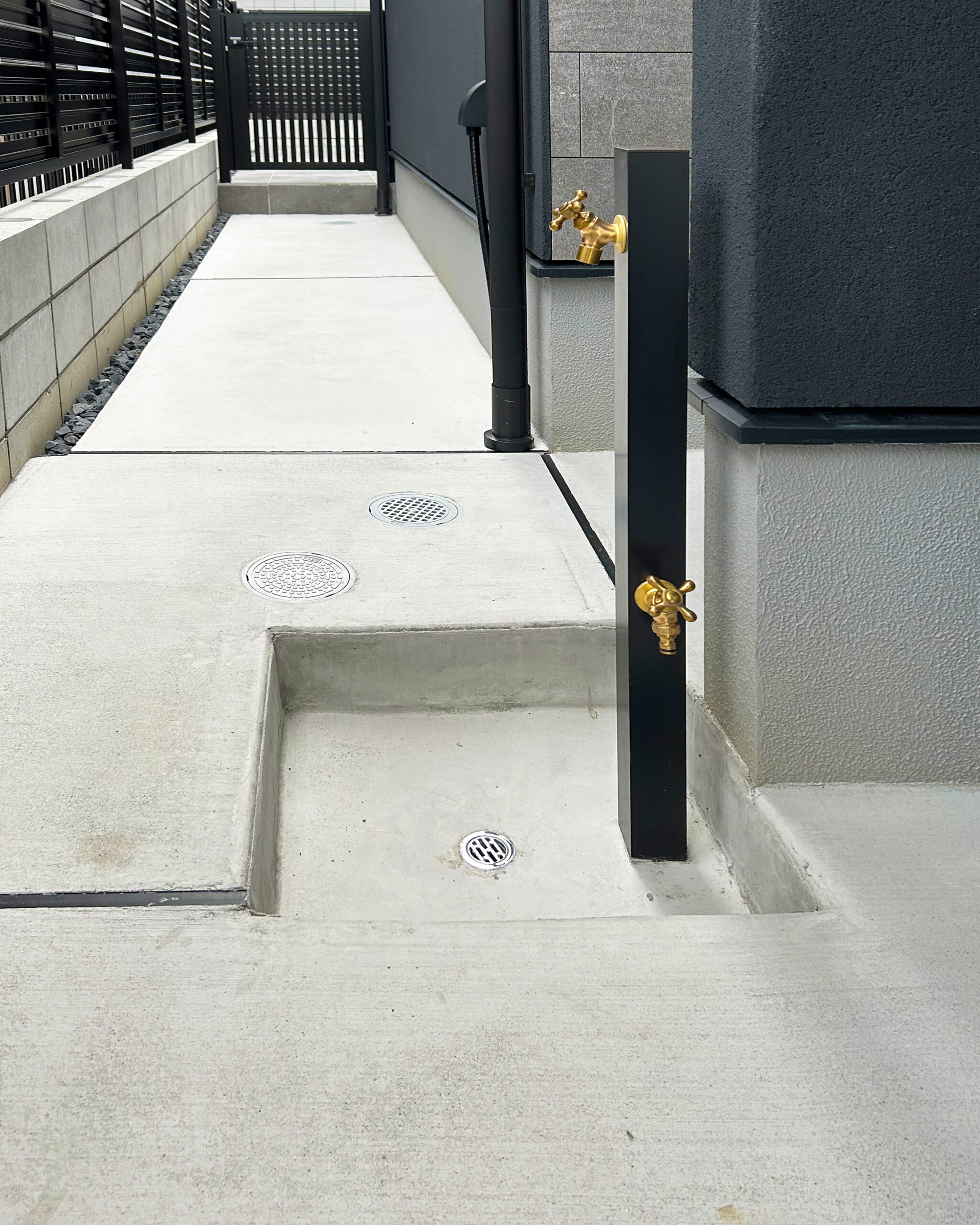 立水栓はアンティークゴールドの蛇口を使用しちょっとしたパーツ選びがおしゃれです。バックヤードは無駄が無いだけでなく、コンクリートタイルと建物のガルバリウム外壁とがとてもマッチし、隅々まで隙のない仕上がりになりました。
