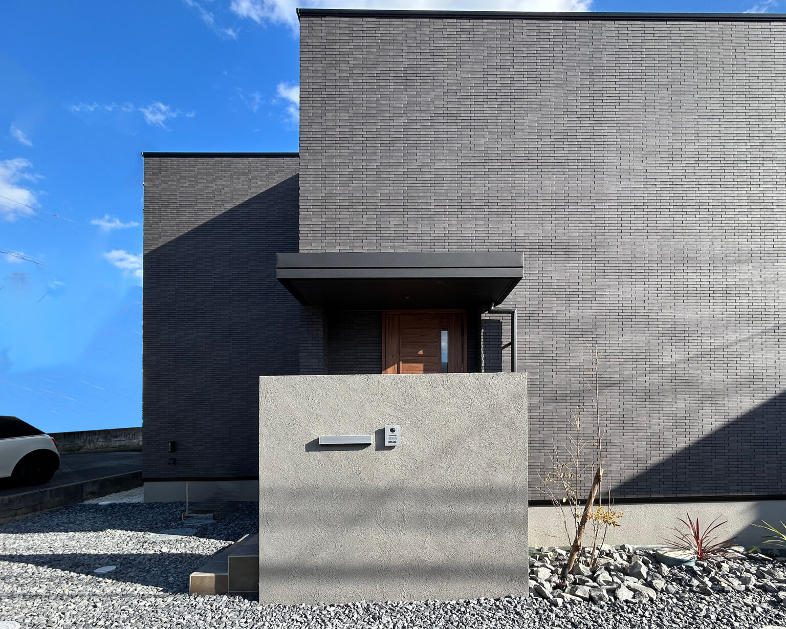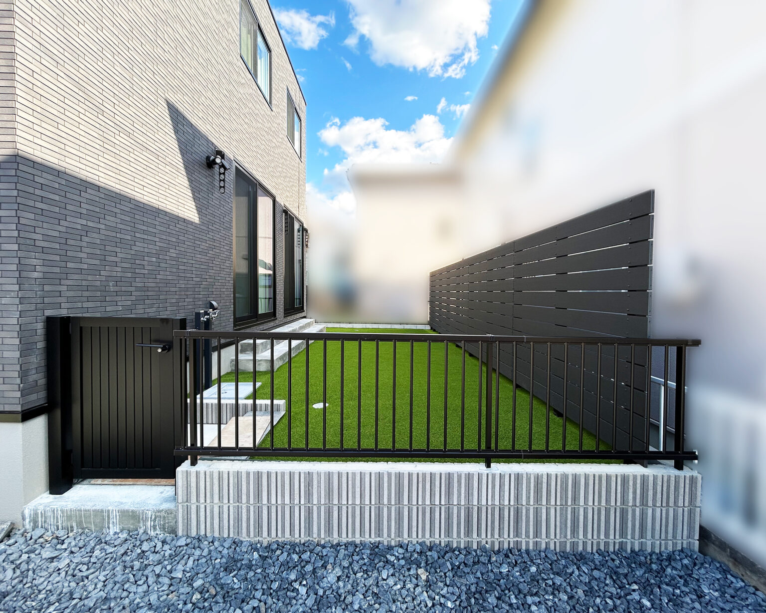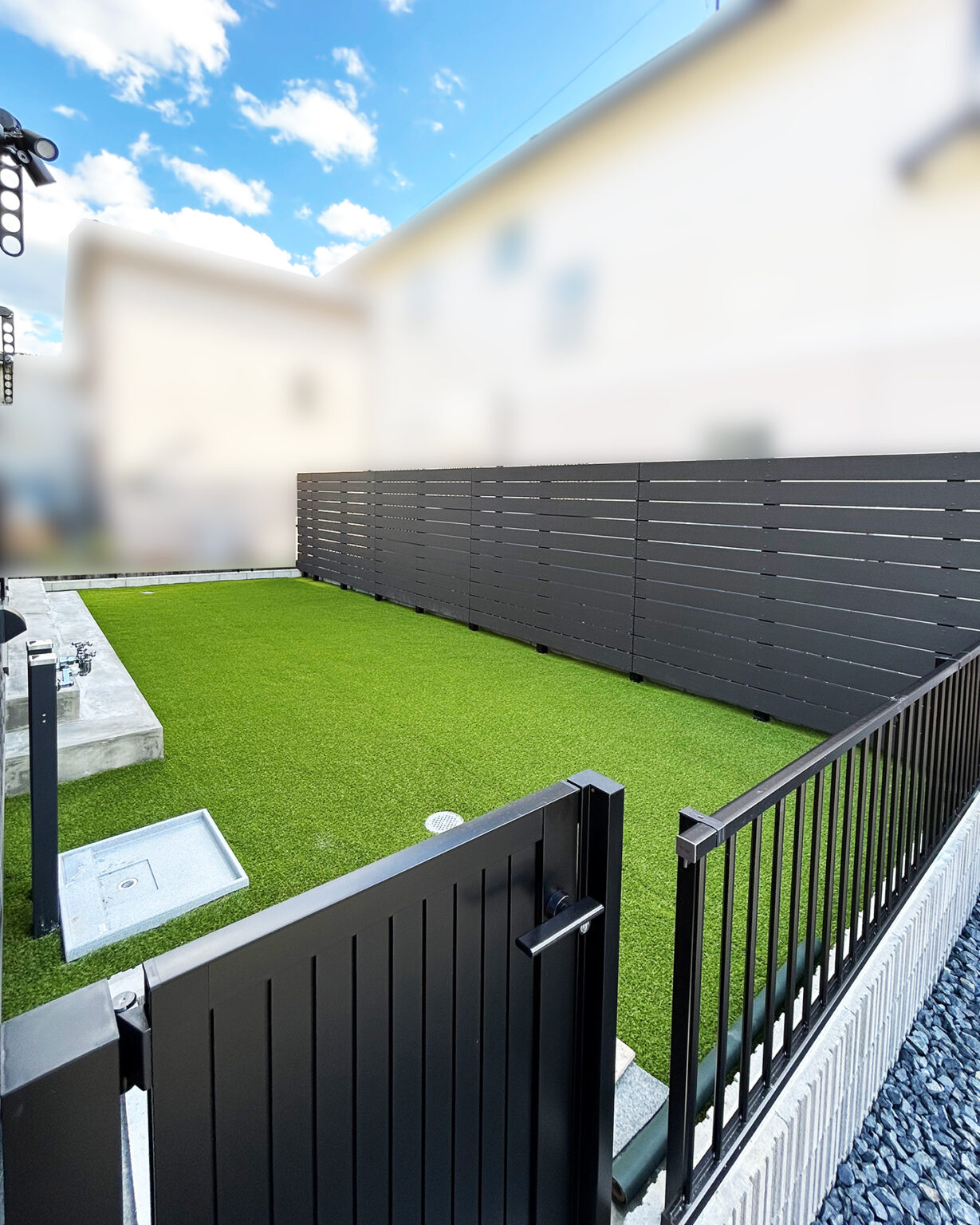 外観デザインを引き締めるグレージョリパッドの門柱。中庭はメンテナンスが簡単な人工芝。