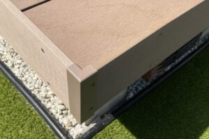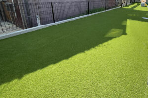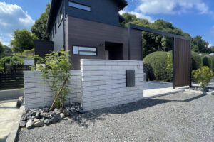 背の高い門柱をシンボルに据えたモダンな外構施工事例です。アプローチには洗い出しやタイルを組み合わせ、ナチュラルかつ高級感のある印象を演出。人工芝の緑が鮮やかに映え、さらにウッドデッキを設置することで、ご家族の団らんやお子様の遊び場として活用できるスペースを確保しました。デザイン性と機能性を両立した施工事例です。