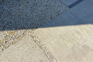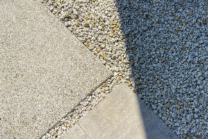 大型門柱と洗い出しアプローチの調和デザイン