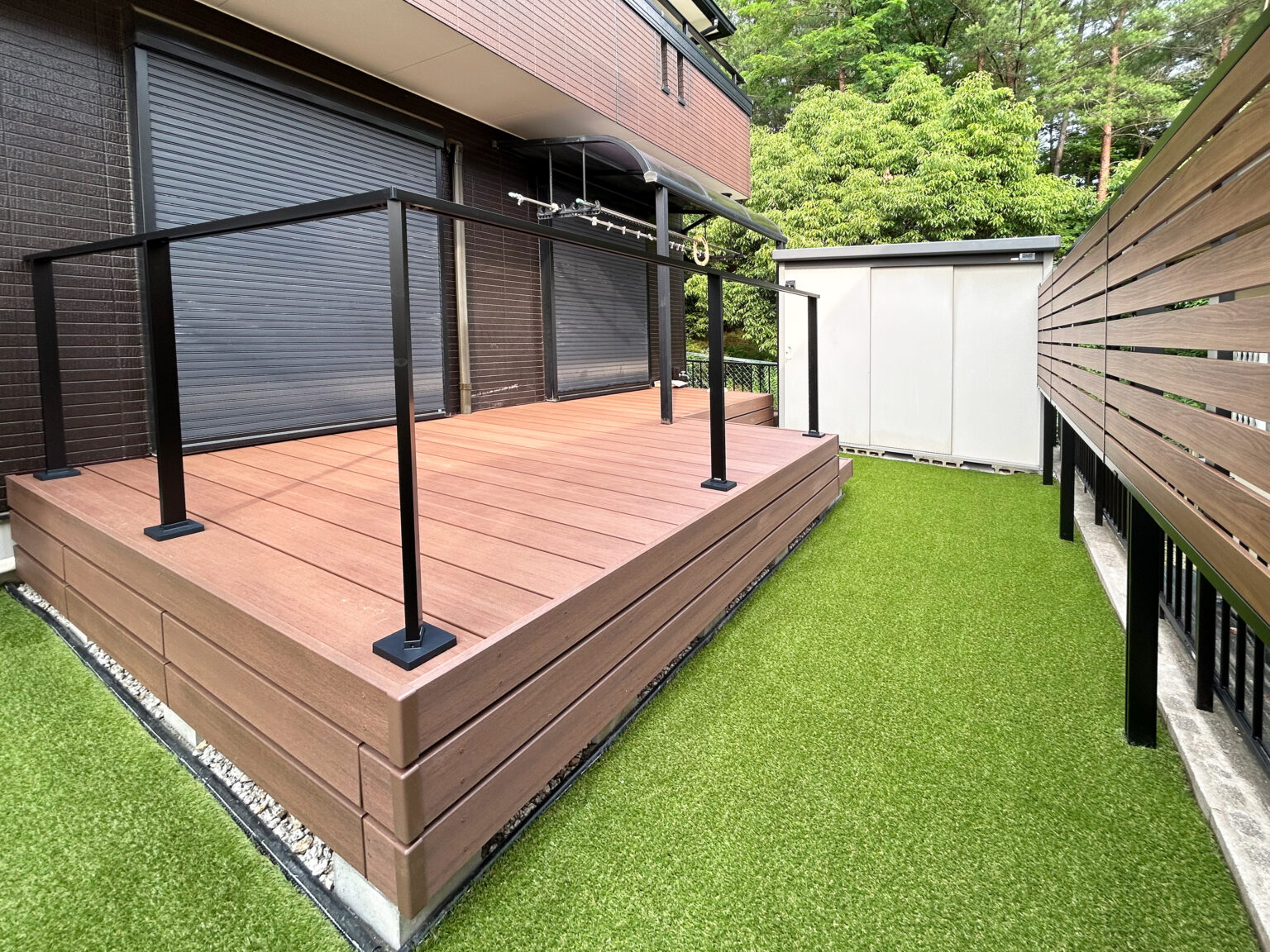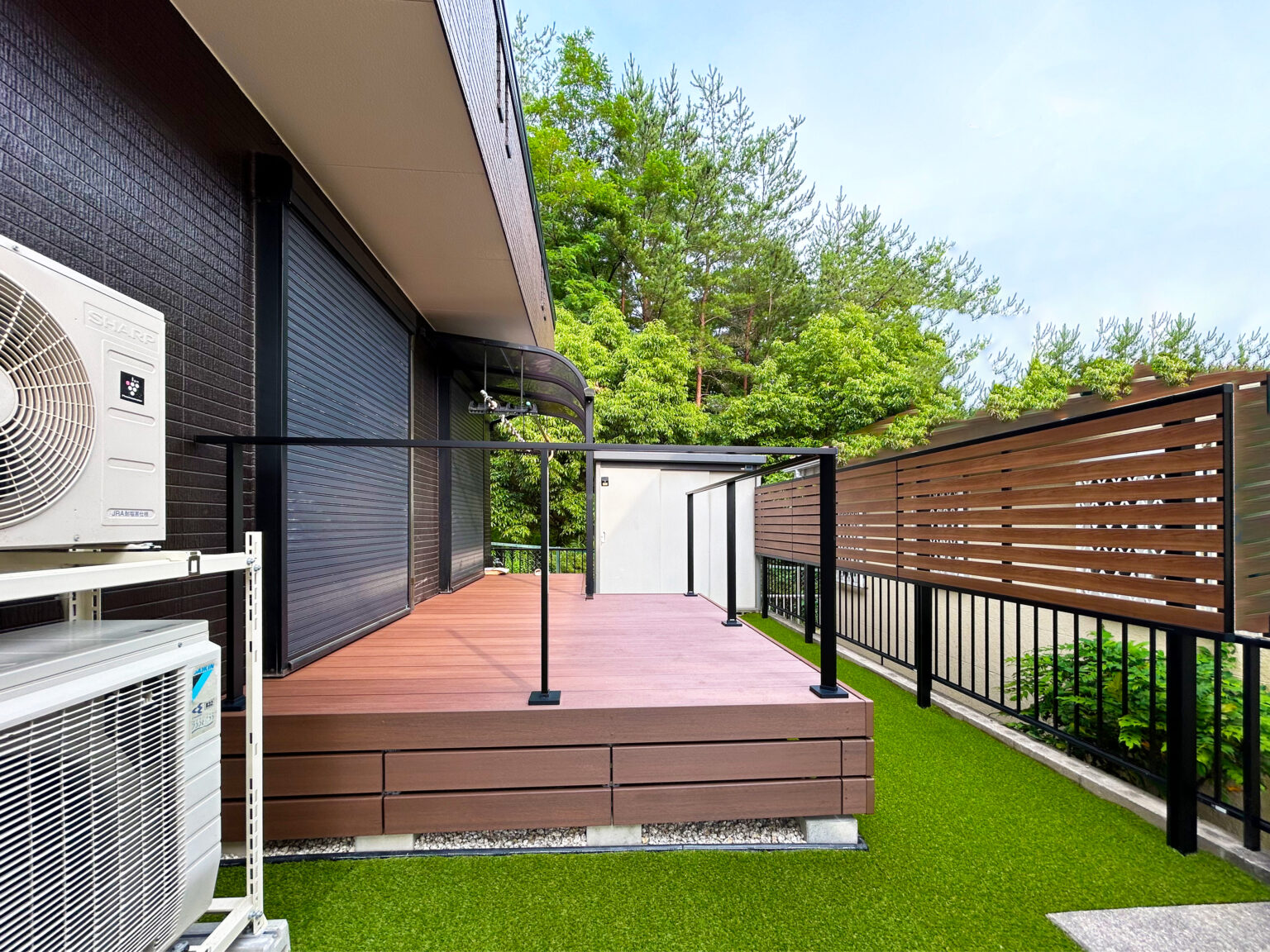 ウッドデッキは人工木を使用していますので、天然木のような温かみがありながら、耐久性に優れています。定期的な塗装も不要です。隣家との敷居は木目調のフェンス。明るいウッドデッキと人工芝で、一気に明るく広々とした雰囲気に。今まで実用性だった場所がリラックススペースが生まれ変わりました。