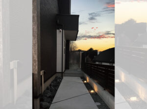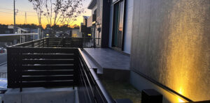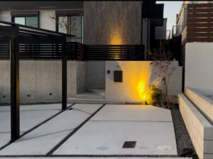 土間コンクリートのシャープなラインとアイアンの手すり、ミニマムのライトアップでスマートでモダンな印象のエクステリアデザイン。