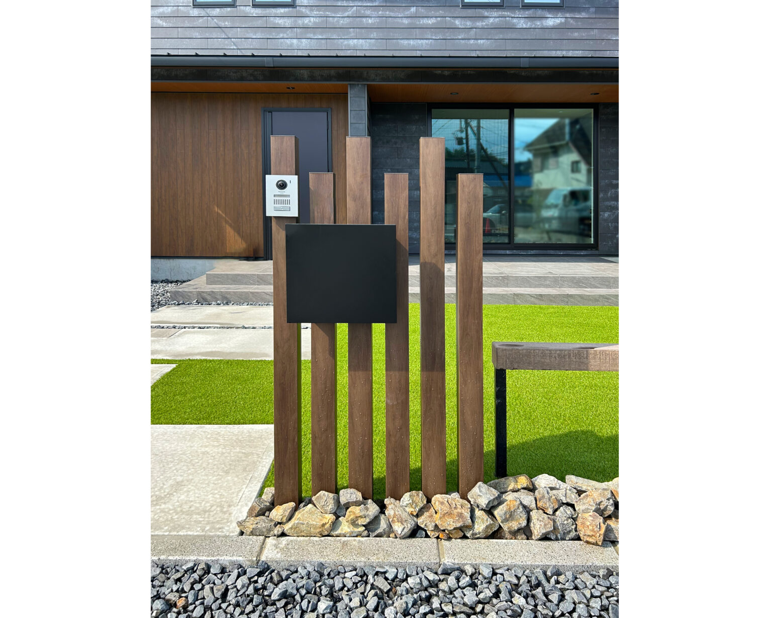さらにシンボルツリーを植栽し、天然石をあしらうことで、自然の温もりを感じられる空間を演出。シンプルながらも上質感のある外構で、家全体の雰囲気を引き立てています。
